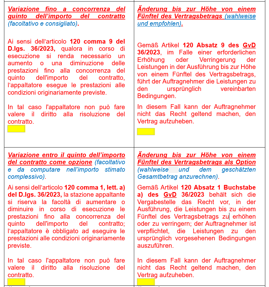 Con il nuovo codice è stata riproposta la fattispecie del quinto d’obbligo, ma come facoltà della SA da prevedere nei documenti di gara iniziali (art. 120 c. 9. “Nei documenti di gara iniziali può essere stabilito che, qualora in corso di esecuzione si renda necessario un aumento o una diminuzione delle prestazioni fino a concorrenza del quinto dell'importo del contratto, la stazione appaltante possa imporre all'appaltatore l'esecuzione alle condizioni originariamente previste. In tal caso l'appaltatore non può fare valere il diritto alla risoluzione del contratto”). Pertanto, se nella documentazione di gara non viene inserita apposita clausola in tal senso, l’appaltatore non sarà costretto ad eseguire agli stessi patti, prezzi e condizioni le modifiche della SA, sempre nel rispetto delle casistiche previste dall’art. 120 c. 1, 2 e 3 del Dlgs 36/2023.